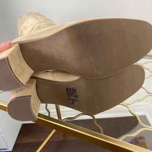 Beige stretch boots with side zip closure. Size 7.5. 2.75" heel. Barely worn. A couple of small minor marks to exterior. Please see photos. Sole is rubber. Textile upper balance man made.