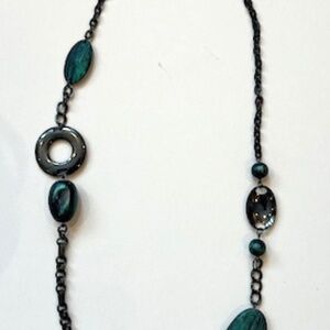4 long necklaces for sale. Brown/wood/mixed material necklace is 14 inches long. Teal/metal necklace is 17 inches long. Multi-strand Silver/Black necklace is 21 inches long. Silver/Black Chain necklace has 4 different link styles on single clasp and hangs 21 inches long.