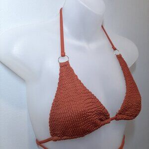 Top: Trendy triangle top with silver ring accents, adjustable halter tie neck, space to add padding if desired, and sexy wrap around strap