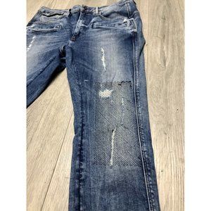 Restored denim with black netting on knee.
