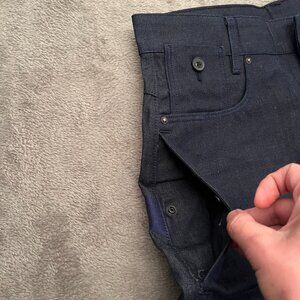 These are G-Star Raw denim shorts, new with tags. The shorts are a dark indigo color . They feature a button fly, front and back pockets, and a raw hem. A removable tag on the back pocket indicates "9.5 OZ KARA DENIM".