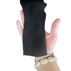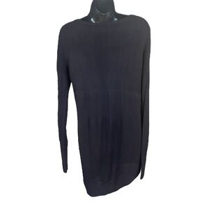 Stretchy black thin knit assymetrical sweater to wear with leggings, jeans, or a skirt. Lovely pattern in reddish colour, pink, and green. A small pull as noted in the picture. It is on a sleeve and very small.
