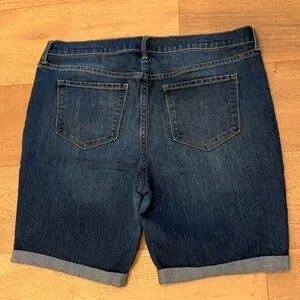 Dark indigo denim shorts with a roll-cuff hem. Five-pocket styling and contrast topstitching. Comfortable mid-rise fit for everyday wear. Size tags have been removed but my guess is a 14/16. See measurements. Has stretch.