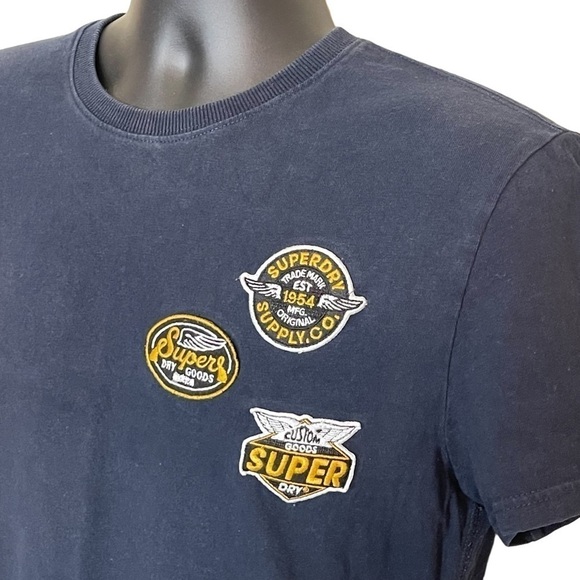 GUC Superdry men’s t-shirt, embroidery patches, navy blue, size medium.