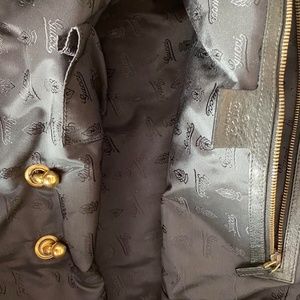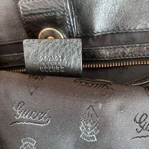 Gucci Fringe Babouska Large Black Leather Handbag Tote, large polished brass and studs. Fringe made of suede with small brass beads on ends. Gucci hearts emblem, lining has one zip pocket, one cell phone pocket, in excellent condition. 19” W x 14” H x 6” handles, open top w/magnetic snap. Email if any questions! Thank you!! :)