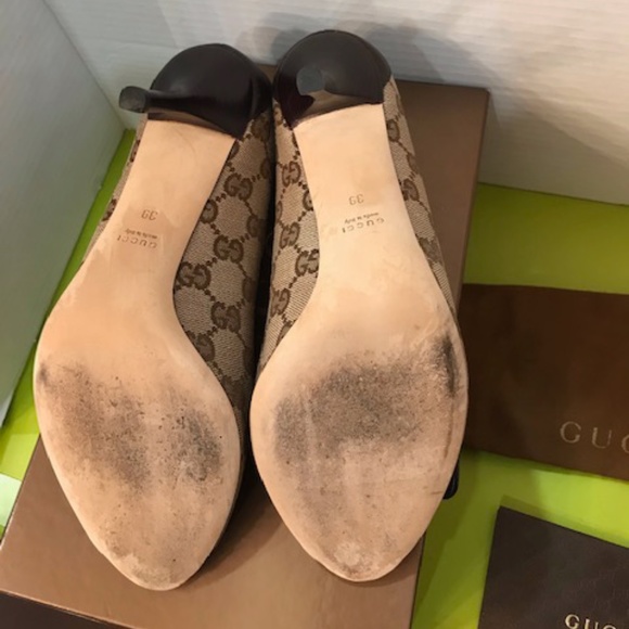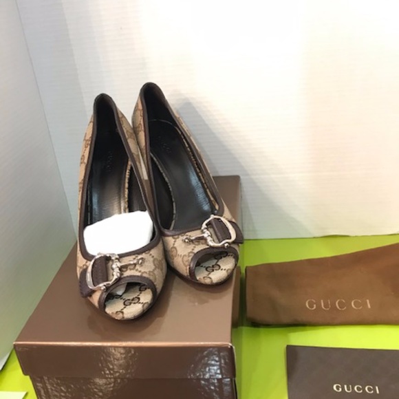 Authentic Gucci GG Print Open Toe Pumps with Buckle