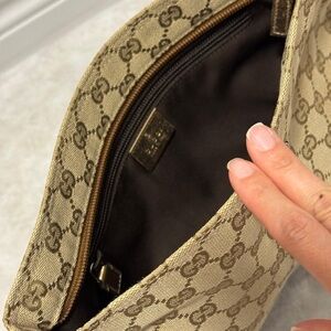 Elegant Gucci messenger bag with iconic monogram pattern. Features adjustable strap for comfort. Ideal for daily wear.