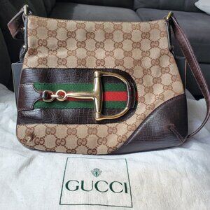 This vintage beauty features rich brown leather highlights, the iconic green and red woven stripe and a golden buckle to bring it all together.