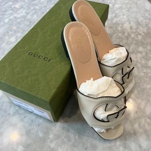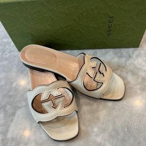 Gucci Interlock GG Cut Out Leather Slide Sandal - 0.4" Heel, Made in Italy, great condition , minimal wear on bottom of ball of foot outer sole.