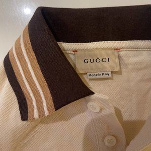 Dark ivory polo shirt for boys and girls by luxury Italian brand Gucci. Made in soft cotton piqué, it has ribbed cuffs and vented sides. The brown ribbed collar is trimmed with beige and ivory stripes, with an Interlocking G logo at the back.