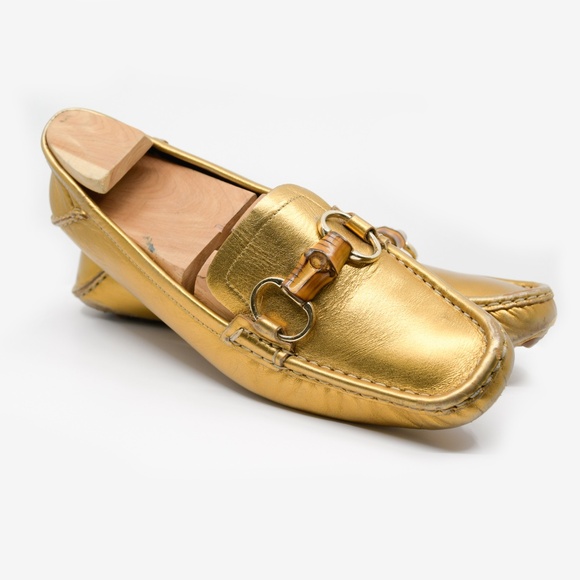 GUCCI Metallic Gold Leather Driving Loafers Bamboo Horsebit Size 10