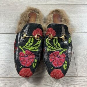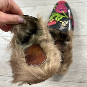 GUCCI Princetown Pink Floral Brocade Jacquard Fur Lined Loafer Slipper Mules