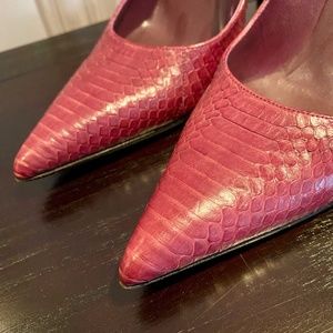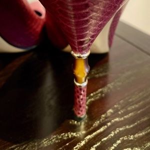 Like new, these snakeskin pumps are a gorgeous iced berry shade with signature Gucci wood detailing on the 2.5" heels.