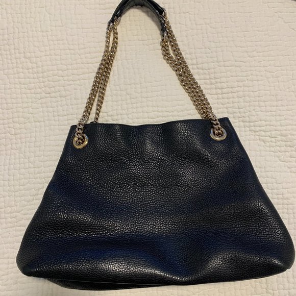 Gorgeous black leather Gucci Soho bag with gold chain + hardware. Light linen interior makes finding items very easy. Can wear across the body or as a shoulder bag.