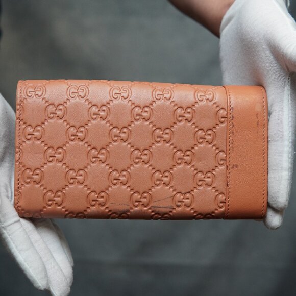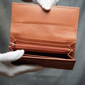 Authentic pre-owned GUCCI Ssima Horse Bit Heart GG Logo Leather Long Bifold Wallet in Salmon. Good overall condition, with signs of usage. Minor scratches, rubs, and small stains are present, though not always visible in photos.