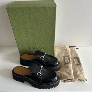 Gucci's mules are modeled on classic loafers - they're even complete with the stitching and notched vamp. Made from glossed-leather, this pair is topped with the house's polished horsebit and has chunky soles to keep you both grounded and comfy.