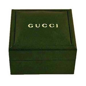 BOX: Genuine green & silver GUCCI box, hinged lid & velvet interior. Has a 1/2 inch tear in box at U in Gucci. Otherwise box & booklets, etc. are in like new condition. Box is 11 in. W x 11 in. H x 7 in. D.