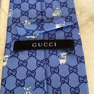 OMG! Authentic 100% silk Gucci tie featuring adorable doggies in fun cartoon style and an all over GG monogram print in dark blue over a light blue.