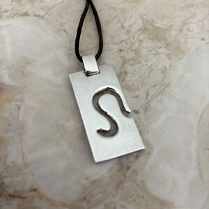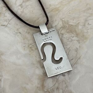 Gorgeous vintage authentic Gucci Leo zodiac dog tag necklace in sterling silver. In very good condition this unisex piece hangs from its original Gucci 18” leather cord with sterling silver screw closure.