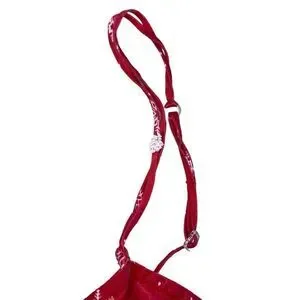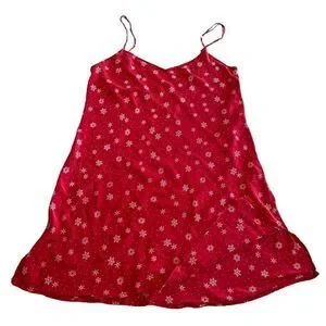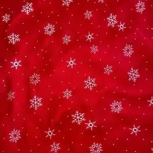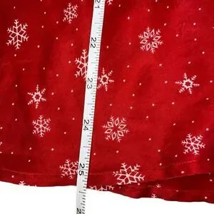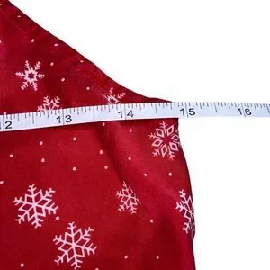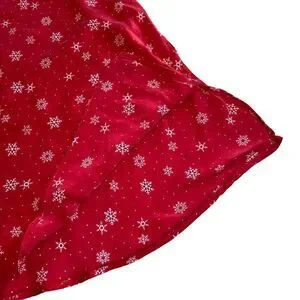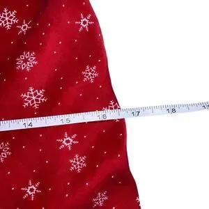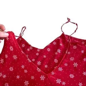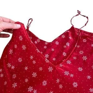Perfect for Christmas nights. Polyester. Small white snowflake pattern on red. Adjustable spaghetti straps. Has been washed a few times but is in good shape.