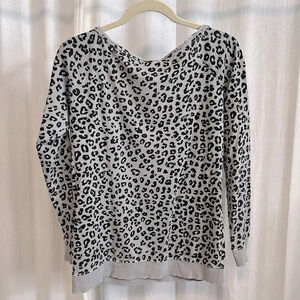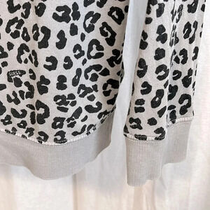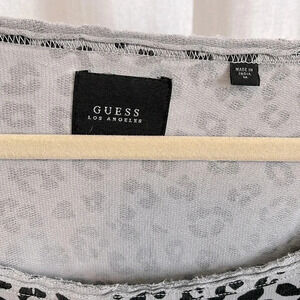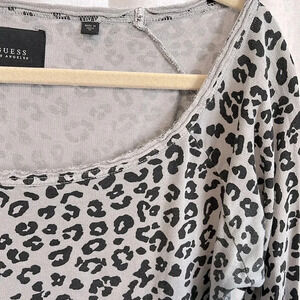 GUESS off the shoulder top in 100% cotton fabric. Lightweight fabric. Cheetah patter in black with grey. Rough edge neckline, ribbed bottom and arms.