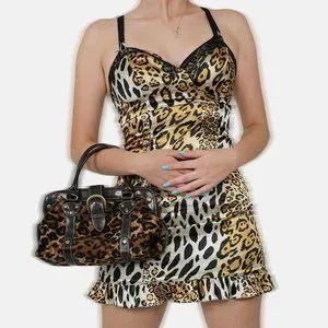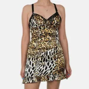 Multiple patchwork animal print cheetah spots/ leopard / giraffe body-con slip dress featuring a a ruffle hem at the bottom + a black lace ruffle at the top & adjustable straps. Great for the summer nights out.