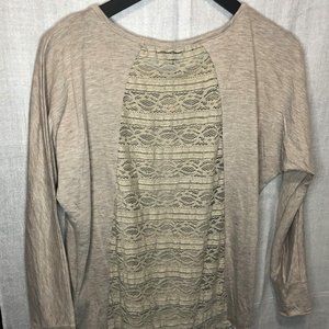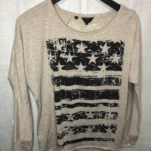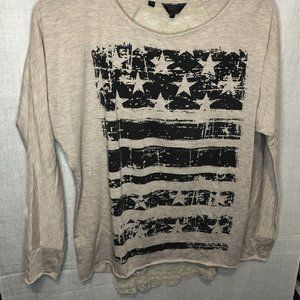 GUESS Beige Long Sleeve Top w Flag Print & Lace Back Detail; lightly worn and perfect for Fall/Winter