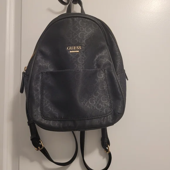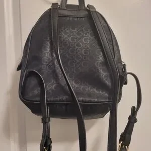 Stylish black backpack with GUESS logo. Features a sleek design and adjustable straps.