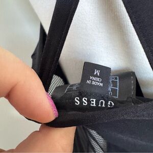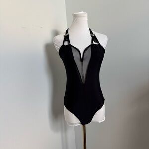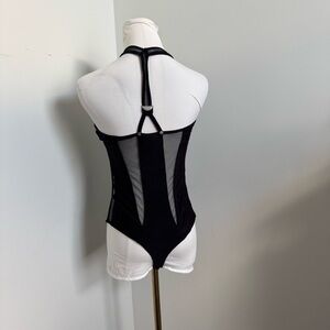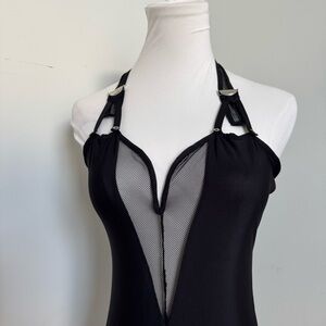 GUESS Black Mesh Bodysuit | Buckle Strap Detail, Deep V, Y2K Clubwear M