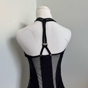 • Features: mesh inset, halter neckline, buckle straps, thong back