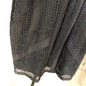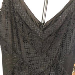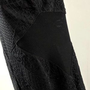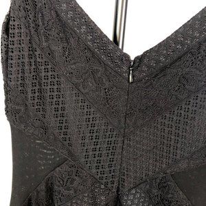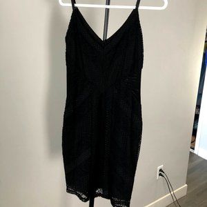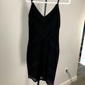 Perfect for a night out. Stretchy and comfortable material. Top layer textured and see through with black solid under dress. Zipper back. Side see through cut out for waist shaping illusion. Lightly worn.