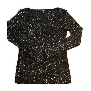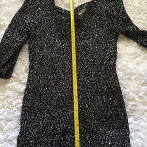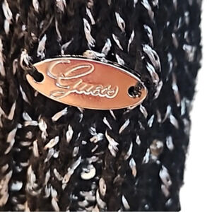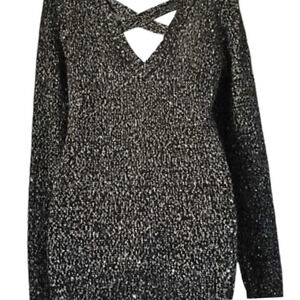 GUESS Black & White Silver Sequins V-Neck Sweater Shirt Criss Cross Back SZ XS