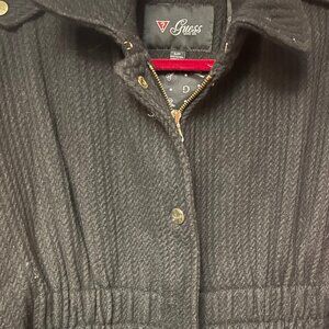Gold-tone hardware including "Guess" engraved snap buttons and a sturdy front zipper.