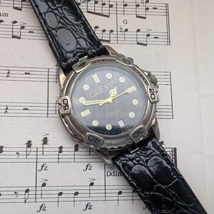 Stylish GUESS watch with a black face and silver accents. Features a black textured strap.