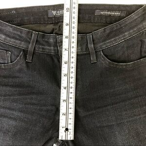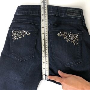 Very dark Navy low rise stretch skinny jeans in Size 27” Very Good condition - hems are A+ No signs of wear or over stretching, no inner thigh wear. Back pocket crystals are all intact and are a mix of hematite dark black grey and a lighter pearl crystal and silver crystal. Great with boots! All sizes are in pics.