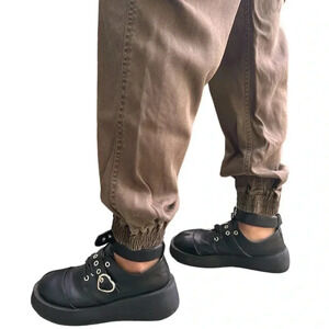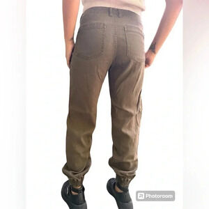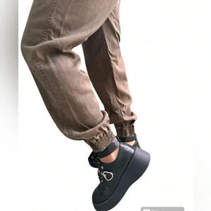 GUESS brown cargo pants, joggers with cuffed legs, Size 4 (Small), 100% Tencel (therefore very soft to the skin, fluid, comfortable). Has 2 side pockets, back pockets and 1 thigh pocket. Zipper & button closure, and elasticized ankles. Very good used condition. Baggy, Streetwear, Grunge