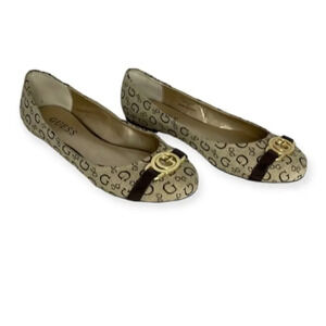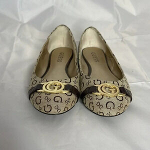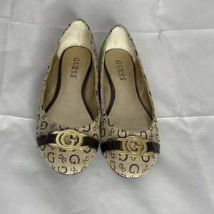 GUESS Claira Round Toe Ballet Flats Signature Logo Tan Brown Gold Textile Size 5