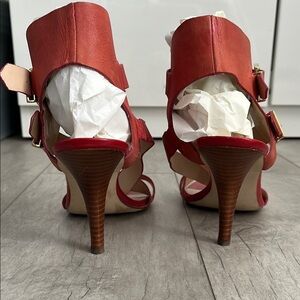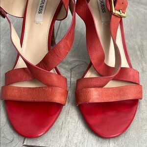GUESS Leather Strappy Heeled Sandals. Step out in style with these strappy heeled sandals. Perfect for any occasion, these shoes offer both elegance and comfort. The color is deep coral with gold hardware. 3.5” heel.