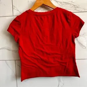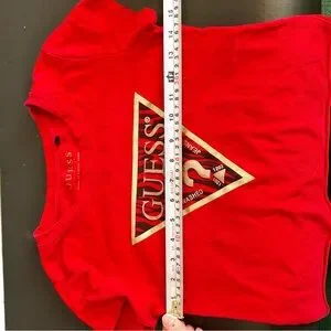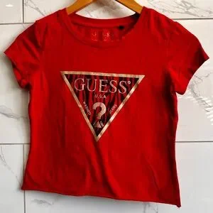 GUESS triangle logo cropped t-shirt with gold glitter outline, short sleeve, soft stretch cotton, raw cropped hem. Tagged XS. Good preowned condition with light wash wear and minor wrinkling from storage, no holes or stains.