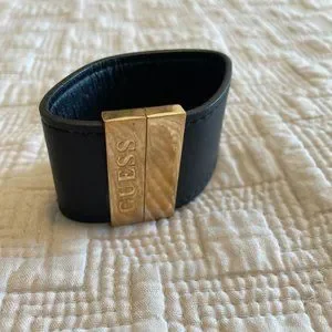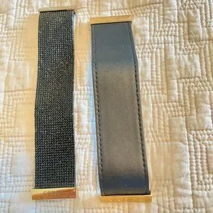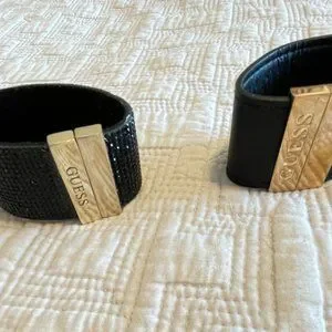 Two Gorgeous Cuffs with magnetic fastener. One is faux leather and 7 1/4 inches in length, 1 1/2 inches wide. The other is a sparkly faux leather and 7 1/2 inches long, 1 3/8 inches wide. In excellent shape!!