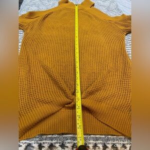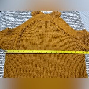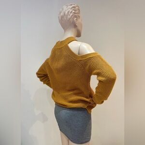 Gorgeous Cold Shoulder Cotton blend sweater in Medieval Gold (or yellow mustard) color by GUESS. Casual Crew Neck, Long Sleeve knit, Oversized fit style.