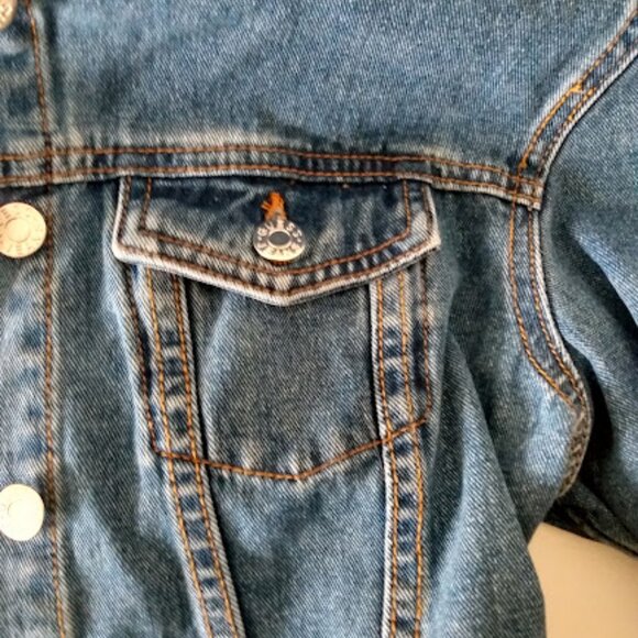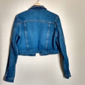 GUESS Denim Cropped Jean Jacket Logo detail on each sleeve. Women's size XL