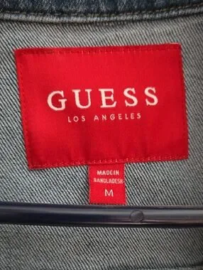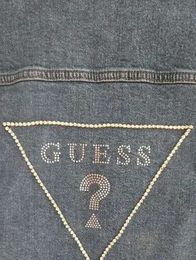 GUESS Distressed Blue Denim Jacket with Rhinestone Logo