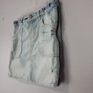 Distressed, light wash, jean denim mini skirt by Guess. Zippers on sides work well. In good used condition. Size 26.