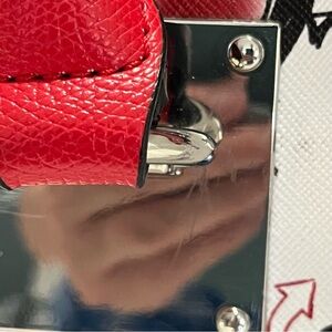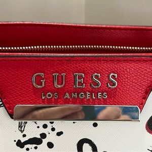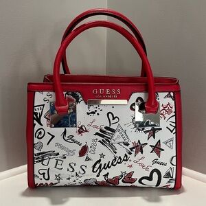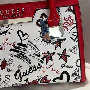 Lipstick red base, sketched imaged pattern on front only. Top zipper closure. Removable crossbody strap. Interior classic Guess pattern fabric. Multiple pockets.