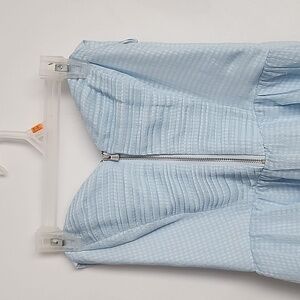 Get ready to turn heads in this stunning blue halter tie flared dress from GUESS. The sweetheart neckline with halter neck ties adds a touch of femininity, while the zippered front and ruched bodice create a sleek silhouette. The tailored waist cinches in for a flattering fit, and the fit and flare skirted bottom flows beautifully as you move. The smocked back ensures the best fit, making this mini dress perfect for any summer occasion. With its stylish blend of blue and white, this dress is sure to make you feel confident and glamorous. Don't miss out on this must-have addition to your wardrobe!