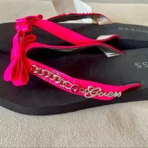 New with tags, cute GUESS flip-flops with silver chain, pink jewel and Guess details on straps. Perfect for summer!