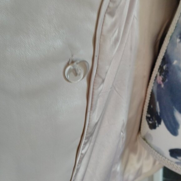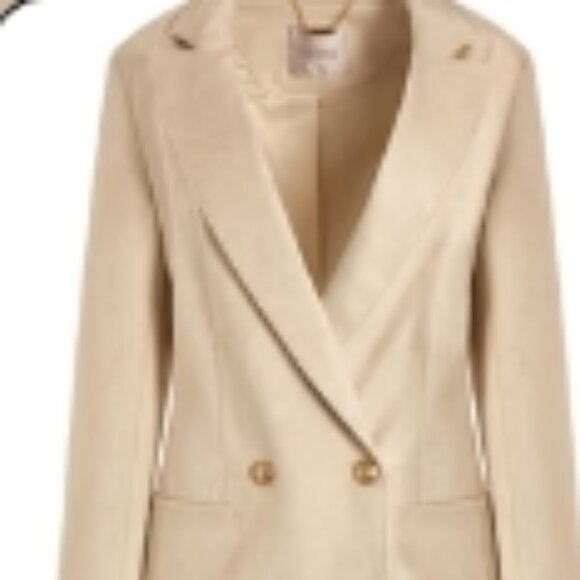 Beautiful fitted double-breasted blazer in a creamy light beige colour "Taupe Smash". The stock photos show the colour best. This beautiful jacket, purchased last year, was only worn a few times and is clean and in perfect condition. Soft, attractive-looking vegan leather fabric. Notched lapes, back double-vents, front welt pockets. Matte finish gold "G" GUESS branded buttons. Nicely finished with inside button to support double-breasted closure, lining satin piping, the inside fabric content label is hidden away in a tiny pocket for comfort and appearance when the jacket is open, comes with a pouch with care instructions, spare button and plastic storage bag.