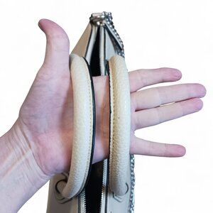 Guess tote bag, ivory handbag, faux leather purse, structured satchel, Guess Garland, leopard lining, silver hardware, crossbody chain, classic Guess bag, women’s tote
