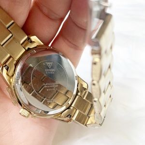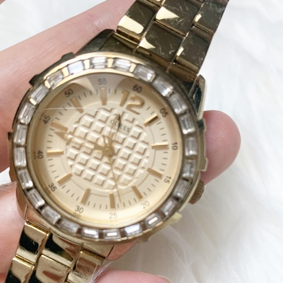 This stunning ladies Guess Girly B model is made from gold-plated steel and has an attractive stone set bezel. This design has a gold colour dial with gold baton hour markers and gold hands. The watch fastens with a gold metal bracelet and powered by a quality quartz movement. 50m water resistant.